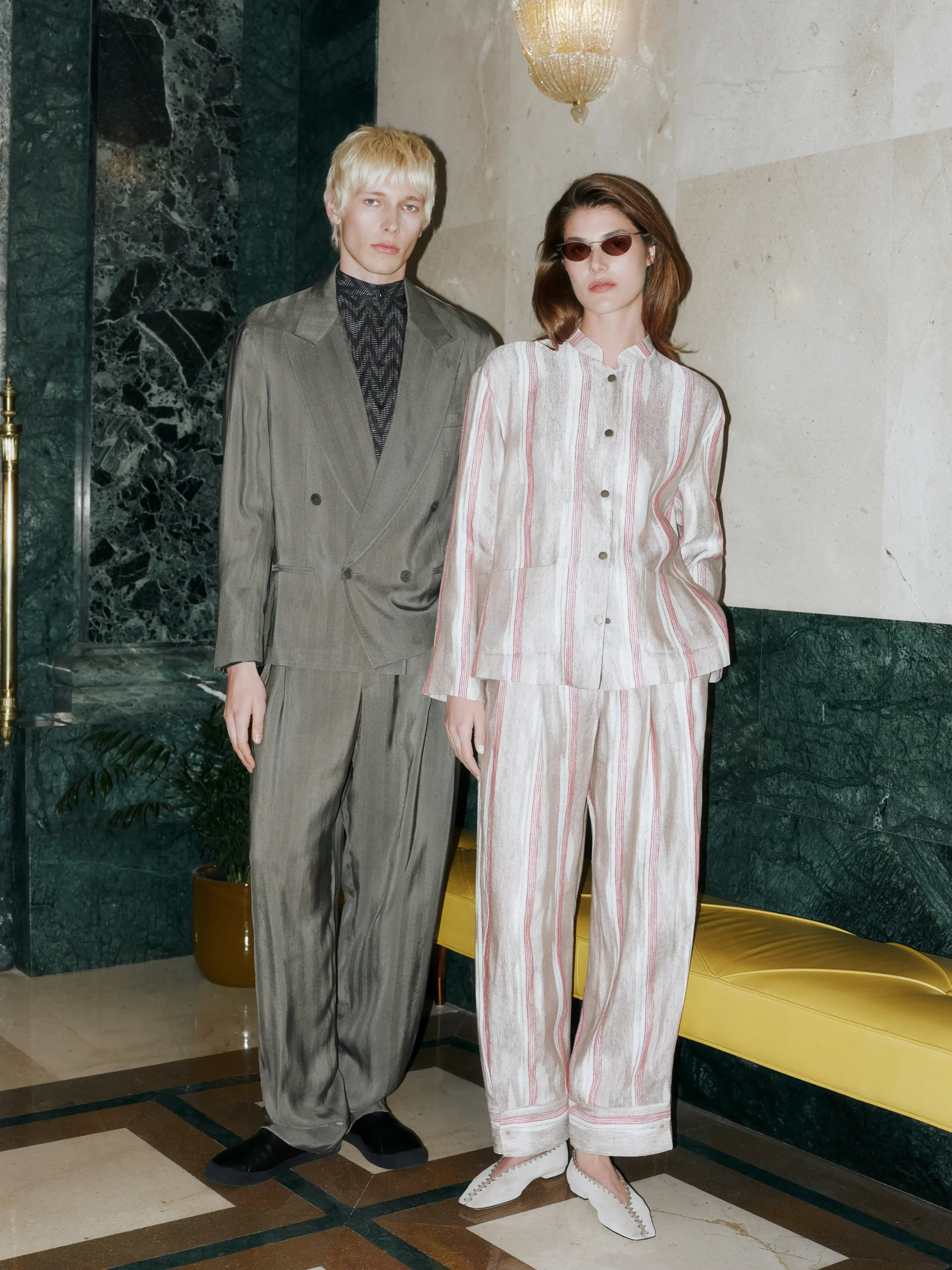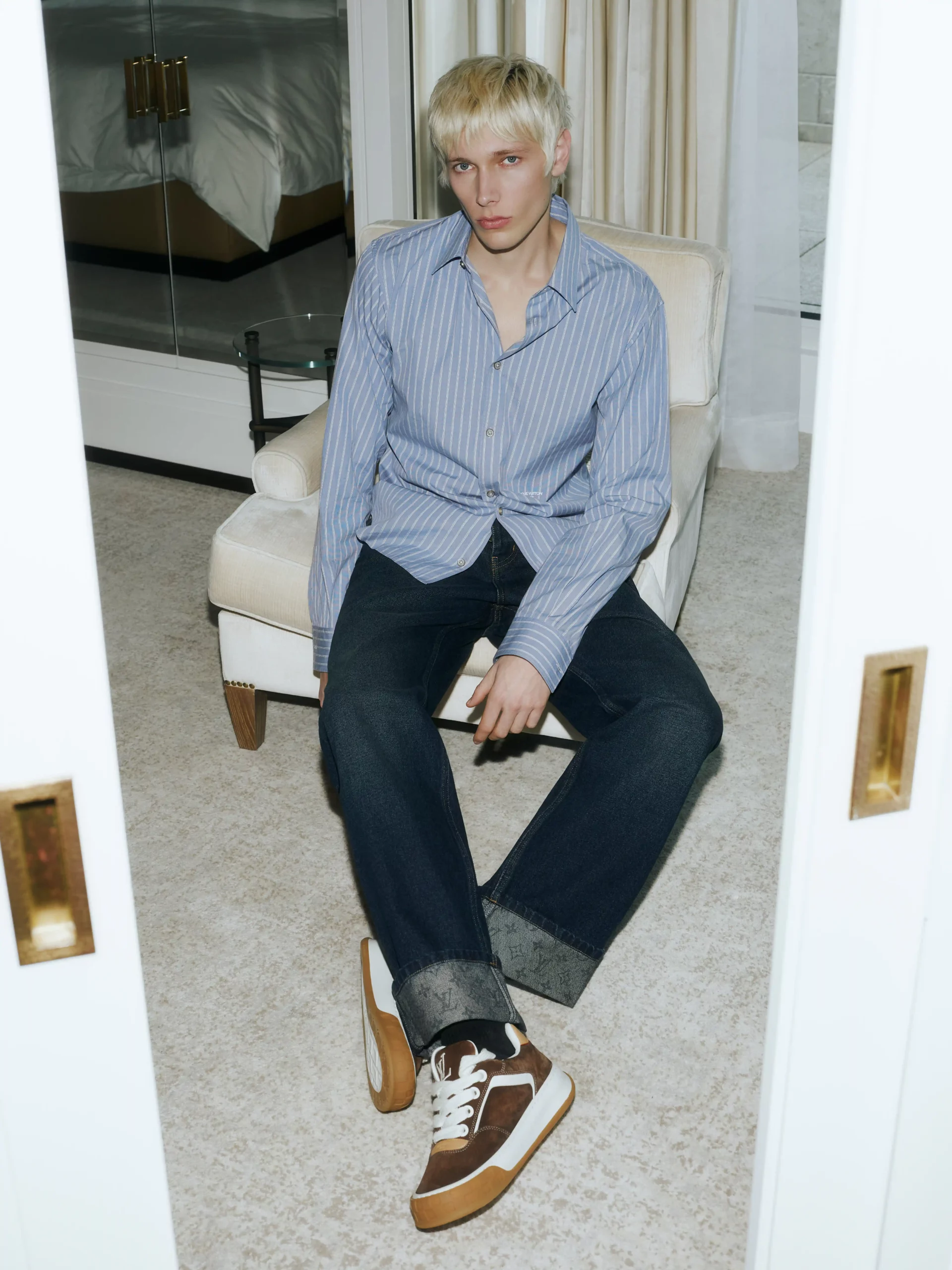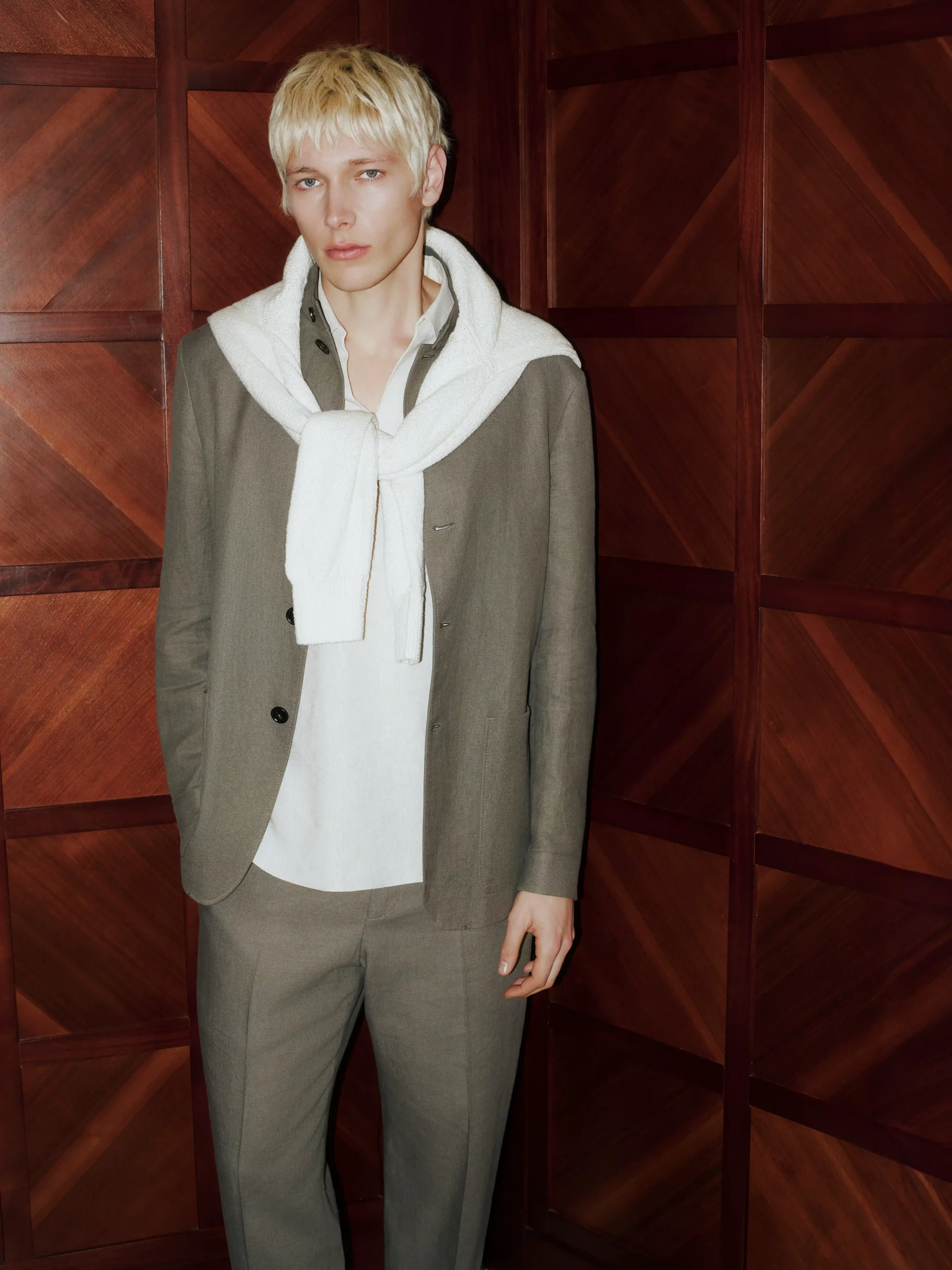La propuesta masculina se presenta entre la sastrería ligera y una elegancia contemporánea que apuesta por la comodidad sin renunciar al estilo. Zegna se sumerge en estos meses de sol con trajes de chaqueta ligeros, idóneos para los meses más calurosos, combinados con jerseys de punto fino en blanco que aportan frescura. Louis Vuitton, por su parte, propone una alternativa más relajada con camisa de rayas azules y blancas y vaqueros, una combinación que demuestra que la elegancia también puede ser cotidiana.